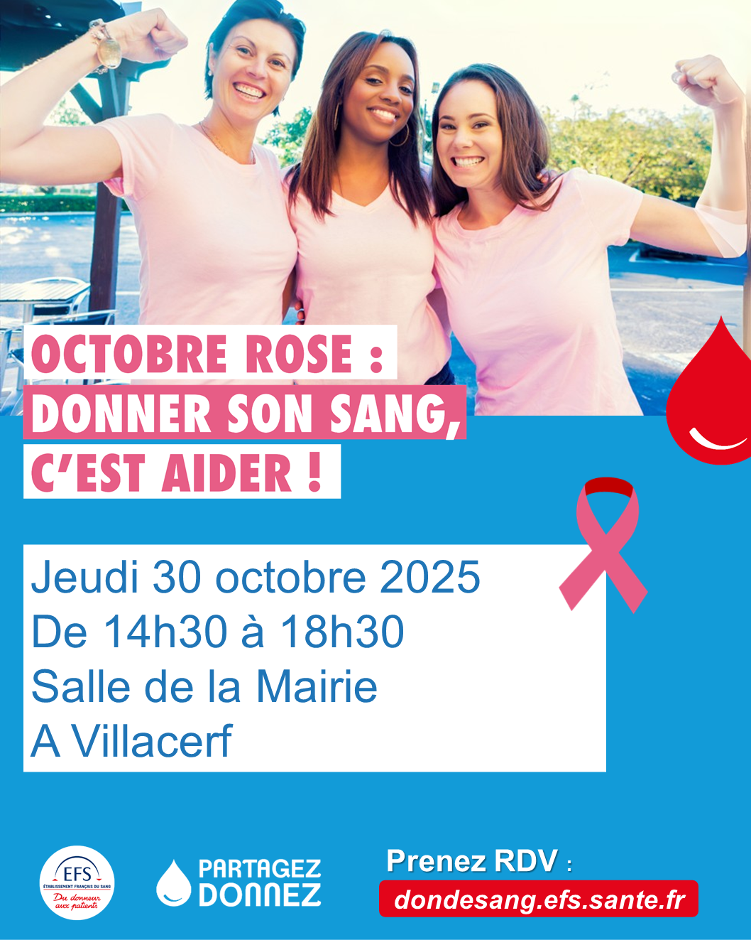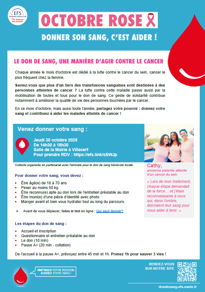 L’EFS organise une collecte de sang à la salle de la mairie de VILLACERF le jeudi 30 octobre 2025 de 14h30 à 18h30