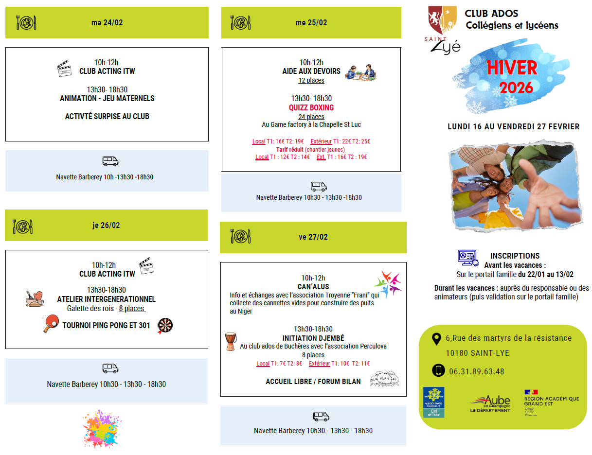 Club ados : du mardi 20 janvier à 19 h 30 jusqu’au vendredi 13 février, minuit.