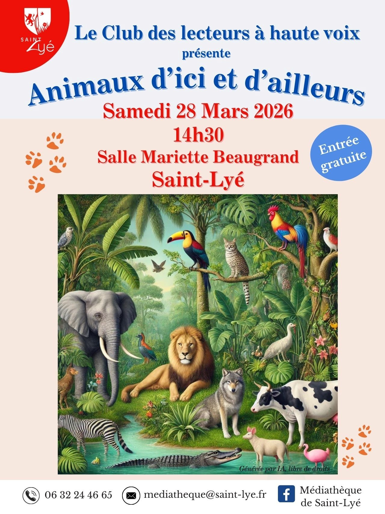 Le Club des lecteurs à haute voix de Saint Lyé a le plaisir de vous inviter à écouter sa dernière création, sur le thème : Animaux, d’ici et d’ailleurs.